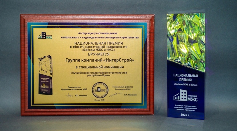 ГК «ИнтерСтрой» стала победителем Национальной премии «Звёзды МЖС и ИЖС» в номинации «Лучший проект малоэтажного строительства в Республике Крым» — одной из самых престижных наград в сфере малоэтажной и индивидуальной жилой недвижимости.