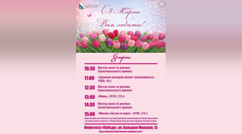 В Севастополе к Международному женскому дню проходит киномарафон «Вам, любимые!», в рамках которого горожанам предлагают бесплатно посмотреть отечественные фильмы.