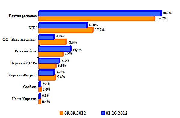За последний месяц, рейтинг Партии регионов вырос более, чем на 2 процента и составляет 40,5%. Компартия Украины несколько сдала позиции. Ее рейтинг – 15,8%. А рейтинг «Русского блока» вырос на 2%. Он составляет -10,4% . У партии «Удар» за месяц – плюс 1 процент. Общий рейтинг – 6,7%. Остальные партии, участвующие в предвыборной гонке, набирают менее 5 процентов