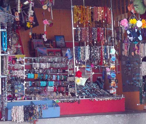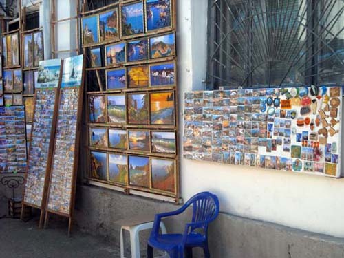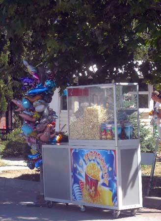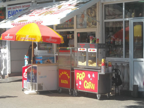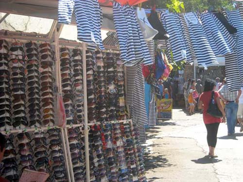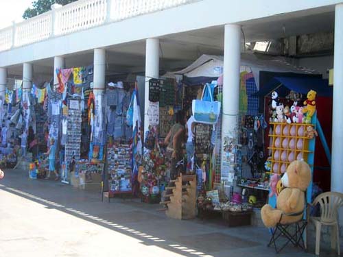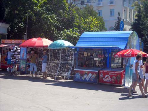 Через несколько метров от часов первые «объекты». Стенды с очками и шляпами. Кстати, самый популярный товар. Чуть дальше – сувениры, брелки, кружки, ложки, кулоны, флажки, статуэтки и многие другие «мелочи жизни». Спустившись на площадку для роликов, можно увидеть целый вещевой ряд – море футболок, морских костюмов, полотенец. Далее по маршруту на глаза попадаются только назойливые «зазывалы» покататься на экскурсионных катерах. Стоят они буквально на каждом шагу. Если вас замучает жажда, то сразу после катеров вы можете выпить лимонада или кваса из больших зелёных бочек. Правда, сколько напитки там хранится и из чего сделаны, - неизвестно. Но люди всё же рискуют своим здоровьем.
