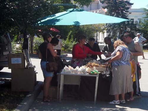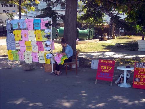 Дальше, до катера, туристов сопровождают холодильные камеры с мороженым, лотки с якобы золотыми украшениями и бижутерией. На площади 300-летия Черноморского Флота не так многолюдно, как и палаток с сувенирами, но торговля всё же идёт.