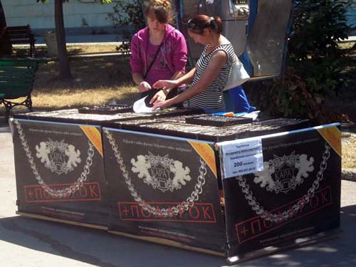 Минуя стихийный рынок выносной торговли, напротив диско-бара «Театральный» поспокойнее, но продавцы есть. Товар – футболки для маленьких детей с весёлыми фразами: «Завидная невеста», «Реальный пацан», «Мужик 100%», «Хочу и ору» и всё в таком же духе. Повторюсь, футболки для детей.