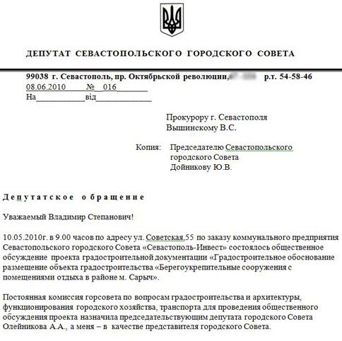 Общественное обсуждение, по мнению депутата Севастопольского городского совета Лидии Столяровой, прошло с вопиющими нарушениями действующего законодательства. В этой связи 8 июня 2010 года Лидия Алексеевна написала письмо прокурору Севастополя Владимиру Вышинскому, в котором изложила факты нарушений. Копию письма депутат передала «Новому Севастополю» для публикации. Депутатское обращение
