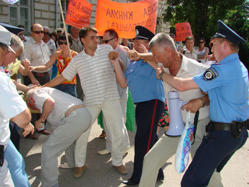 Инциденту у Дома офицеров предшествовала еще одна стычка. Она возникла часом раньше у штаба ЧФ, что на соседней с ДОФом улице. После безрезультатного взывания к …оцеплению морских пехотинцев, охранявших российский штаб, один из лидеров группы обманутых пайщиков 60-летний Александр Добровольский выхватил баллончик с краской и начал быстро вычерчивать на асфальте перед КПП штаба «ГДЕ НАШИ КВАРТИРЫ?». В этот момент милиционеры попытались прервать незаконную, по их мнению, акцию по нанесению «граффити» на асфальт. Началась борьба: теперь уже гражданское «мини-оцепление» пыталось дать своему лидеру возможность дописать баллончиком на асфальте.