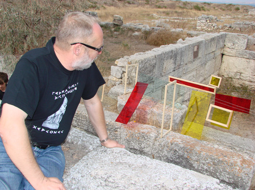 Развешенные черно-белые фото дамы испанской внешности, хаотично подвешенные на лесках цветные стекла, «легкие» абстракции, закрепленные прямо на древнегреческих камнях и другие «ассоциативные и аллегоричные объекты» – такой вчера предстала перед участниками завершающегося сегодня в Севастополе международного фестиваля современного искусства «Антика и Авангард» знаменитая 900-метровая улица Херсонеса. Финальная инсталляция завершала десятидневный арт-форум.