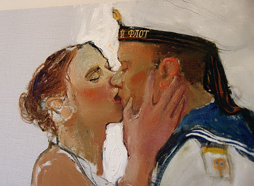 Но более других полотен, по общему мнению, своей душевностью привлекла работа, где моряк обнимает и целует свою девушку. Глядя на простой, пусть где-то даже «шаблонный» (матрос и девушка), но с душой выполненный сюжет, невольно задумываешься: флотские будни, они ведь «серые», тяжелые, но как на флоте без романтики и без той, которая ждет…