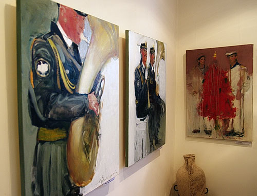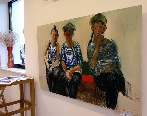 Вместе с многочисленной публикой, которой было так много, что действительно и яблоку негде было упасть, мы протискиваемся вдоль стен галереи. Вот «дембеля» с Черноморского флота играют на гитаре. Следом изображены играющие уже на духовых инструментах музыканты украинского флотского оркестра.