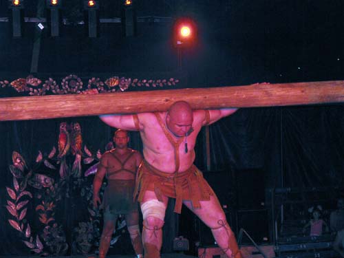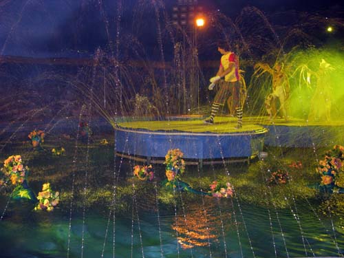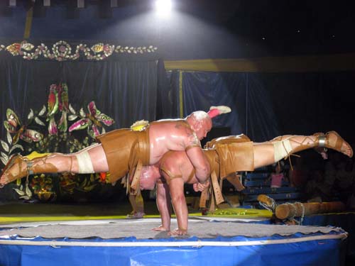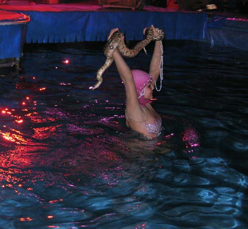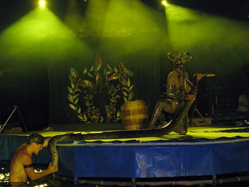 Оксана оказалась права. Наряду с привычными для многих и обязательными для цирков вообще выступлениями гимнастов, клоунов (кстати, здесь они веселят народ не только на сцене, но и в бассейне), дрессированных животных здесь зрители ,например, становятся свидетелями борьбы человека в воде с огромной пятиметровой змеей. Нескончаемыми аплодисментами сопровождается выступление 29-летних силовых атлетов Руслана Гильмулина и Дмитрия Надолинского, вес которых 130 и 120 килограммов. Они крутят на шее многометровые бревна, вес которых вполне сопоставим с их собственным весом. Кроме того, они устраивают головокружительные карусели, держа на плечах бревна с качелями для людей. Поражает и выступление одной из гимнасток, которая под куполом крутится с такой скоростью, что напоминает раскрученный волчек или юлу.