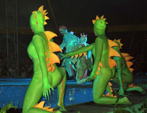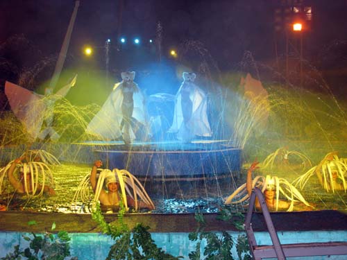 Не могут не впечатлить выступления аква-группы как в бассейне, так и на его бордюре. Причудливы наряды, делающие девушек то сиренами, то русалками, то неведомыми мифическими морскими животными.