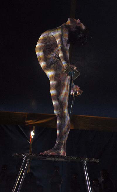 Из беседы с художественным руководителем (он же технический директор цирка на воде) Сергеем Волошиным я узнал, что это уже третье турне цирка по Украине, причем два из них «Цирка на воде». Проекту три года. Родился он в Нижнем Тагиле, там же где и был создан на танковом заводе уникальный съемно-разборный бассейн, вмещающий 150 тонн воды.