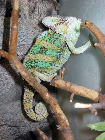 Верно сказано: лучше один раз увидеть, чем сто услышать. На выставке экзотических животных Сергей Трофимов – сын Александра Григорьевича показал мне взрослую парочку йеменских хамелеонов, которые стали многодетными родителями. Самец крупнее и ярче самки. Причем, завидя равного ему соперника, он в течение нескольких секунд поменял свой окрас, стал местами ярким и зеленоватым и изменил позу, показывая «сопернику» всю свою длину, а значит и силу. А соперника «вызвали» с помощью…зеркала.
