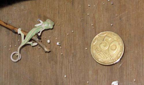 В Севастополе появились на свет около двух десятков крохотных йеменских хамелеончиков. Размером они пока от двух до трех сантиметров. Эти крохотульки продолжают появляться на свет, вылупливаясь из яиц, помещенных в инкубатор. Всего яиц в этой кладке около полусотни.