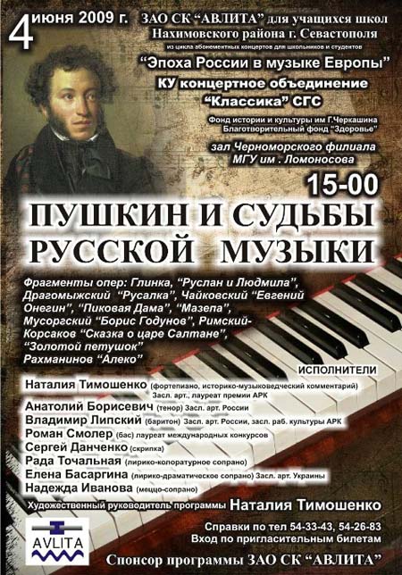 ─ Конечно же, в канун 210-летия А.С.Пушкина, этот концерт ─ прежде всего дань уважения великому поэту, увековеченному, в том числе, и в классической музыке, ─ рассказала Наталья Тимошенко. ─ Вместе с тем, это лишь часть нашей большой просветительской работы, которую год за годом в Севастополе и его пригородах проводит группа единомышленников, посвятивших себя классической музыке. Не секрет, что современная информационная среда культивирует антигуманистические мировоззренческие установки, безнравственность, жестокость. Это особенно опасно для подрастающего поколения. Мы ─ музыканты ─ предлагаем альтернативу ─ воспитательную просветительскую программу, позволяющую поддерживать такой необходимый обществу сегмент как классическая музыка. Да, сегодня ─ век Интернета. Однако, и на Западе, и в России воспитанию молодежи на лучших образцах мировой классической музыки удаляется огромное внимание. Я надеюсь, так будет и в Севастополе…