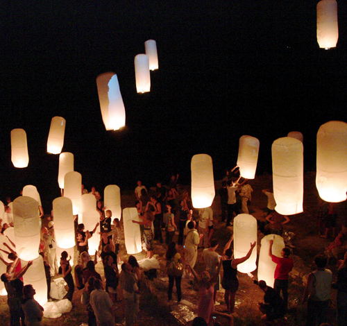 Удар колокола, и фестиваль объявляется открытым. В небо плавно поднимаются 100 факелов-фонариков, вмещенные в своеобразные открытые цилиндры, размером примерно 1 метр на 40-50 см. Группами и один за другим со стороны кромки моря они прощаются с землей и практически вертикально (слава Богу, повезло с погодой!) поднимаются высоко в небо и этаким созвездием направляются в сторону города, где 100 лет тому назад зарождалось отечественное кино.