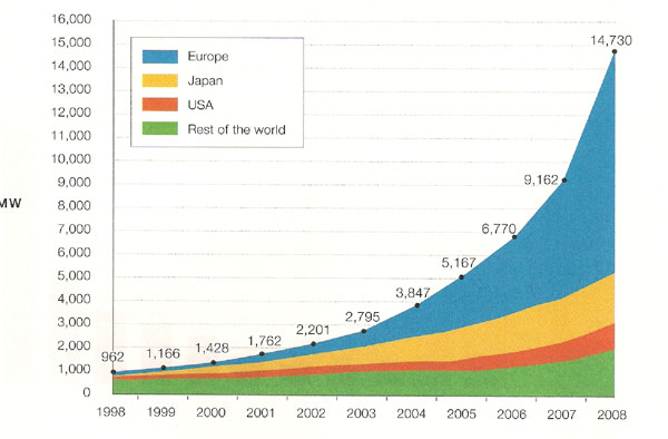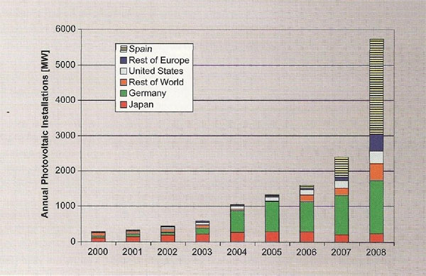 В Испании в 2008 г. рост фотовольтаики составил 348%, т.е. в течение одного года введено 2,5 ГВт солнечных фотовольтаических установок (более 1/3 того, что произведено в мире в этот год). Это видно из ниже приведенных диаграмм и графиков.