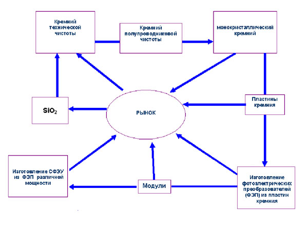 Каждый продукт в технологической цепочке производства СФЭУ является ликвидным, т.е. реализация проекта может начинаться с любой стадии и заканчиваться любой стадией производства, представленного на схеме.