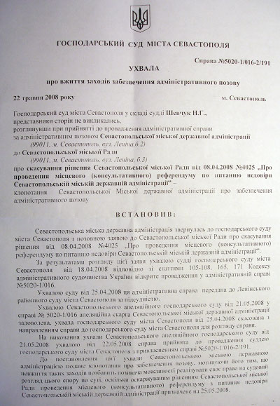 22 мая Хозяйственный суд города Севастополя по иску Севастопольской городской государственной администрации к Севастопольскому городскому совету вынес определение об обеспечении мер иска, которым запретил проведение референдума 25 мая, назначенного в соответствии с решением Севастопольского городского совета от 8 апреля 2008 года № 4025 «О проведении местного (консультативного) референдума по вопросу недоверия Севастопольской городской государственной администрации».