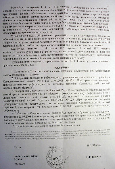 Суд запретил «Севастопольскому городскому совету принимать какие-либо решения относительно проведения 25 мая 2008 года других форм опроса населения или назначения на 25 мая 2008 года какого-либо вида мероприятий, связанных с анкетированием или опросом населения относительно Севастопольской городской государственной администрации и ее председателя».