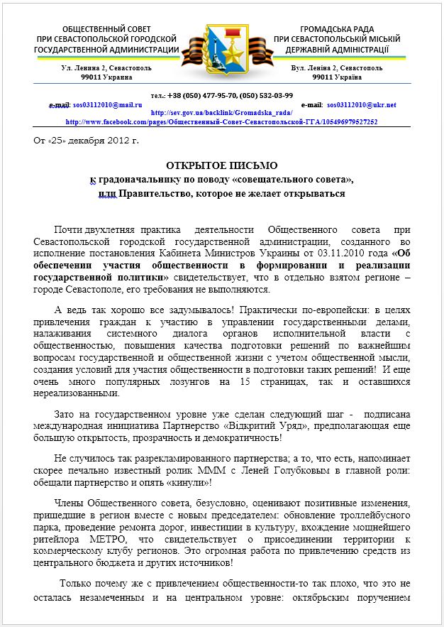 Людмила Панова в открытом письме напомнила, что требования постановления Кабинета Министров Украины от 03.11.2010 года «Об обеспечении участия общественности в формировании и реализации государственной политики» «в отдельно взятом регионе – городе Севастополе, его требования не выполняются».