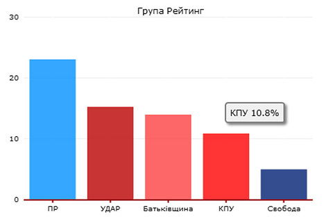 За Партию регионов готовы отдать голоса 22,2% всех опрошенных (27,8% тех, кто собирается принять участие в голосовании); за «Батьківщину» — 15,4% всех опрошенных (19,4% тех, кто собирается принять участие в голосовании). Партия «УДАР Виталия Кличко» набрала 14,8% голосов всех опрошенных (16,6% тех, кто собирается принять участие в голосовании). За Компартию Украины готовы проголосовать 9,6% всех опрошенных (11,2% тех, кто собирается принять участие в голосовании).