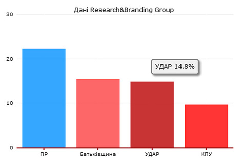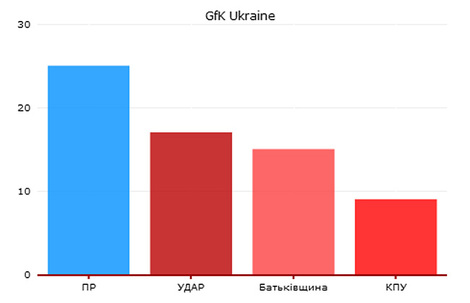 По данным последнего опроса GfK Ukraine, Партию регионов поддерживают 25% избирателей, УДАР – 17%, «Батьківщину»– 15%, КПУ – 9%, «Свобода» и «Украина – Вперед» не проходят в Раду с рейтингами на уровне 3%.