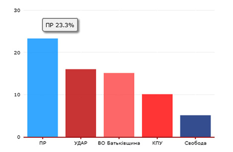 По данным последнего опроса, проведенного Фондом «Демократические инициативы» совместно с Киевским международным Институтом социологии, лидером парламентской гонки является Партия регионов (23%), второе-третье место делят «УДАР и "Батьківщина» (16% и 15% соответственно), с 10% поддержки избирателей в Раду проходит КПУ и впервые за все время опросов избирательный барьер перешагнула «Свобода».