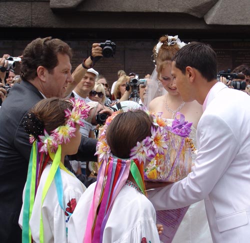 В торжественной обстановке к «Вечному огню» ложатся букеты цветов, звучит гимн Севастополя. Со словами приветствия к виновникам торжества обратился председатель Севастопольской городской государственной администрации Сергей Куницын: «От имени государства Украина, от городской администрации хочу поздравить молодоженов, а тем кто отмечает «золотую свадьбу» еще раз прожить столько же. Молодоженам желаю брать пример с тех, кто празднует сегодня «Золотую свадьбу». Я поздравляю Вас с праздником. Счастья, здоровья! Горько!»