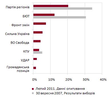 За БЮТ собираются проголосовать 12,5%, за "Фронт змин" - 7,5%, за партию "Сильная Украина" - 5,6%, за ВО "Свобода" - 4,3%, за Компартию - 3,6%, за партию "УДАР" Виталия Кличко" - 2,2%, за партию "Гражданская позиция" - 1,7%. В мае 2010 за Партию регионов готовы были проголосовать 39,1% всех опрошенных, в октябре - 26,7%.