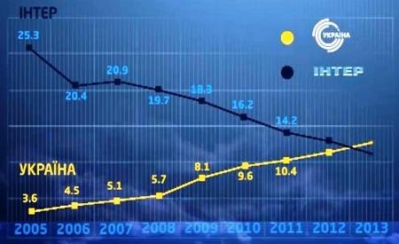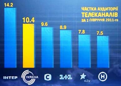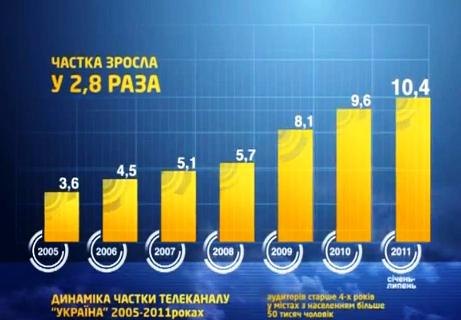 По ее словам, сегодня "Украина" вышла на второе место по аудитории от 18 лет и старше в городах от 50 тыс. жителей. По итогам первого полугодия 2011 года доля аудитории составила 10,4%. Это второй результат после "Интера" с 14,2%.