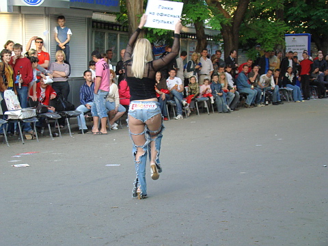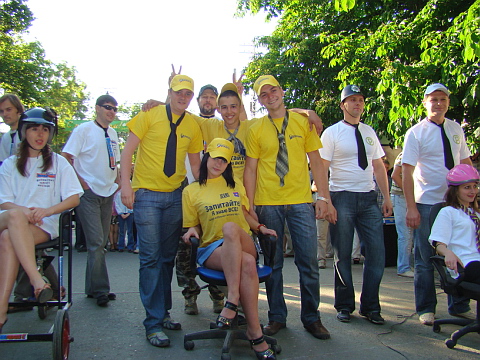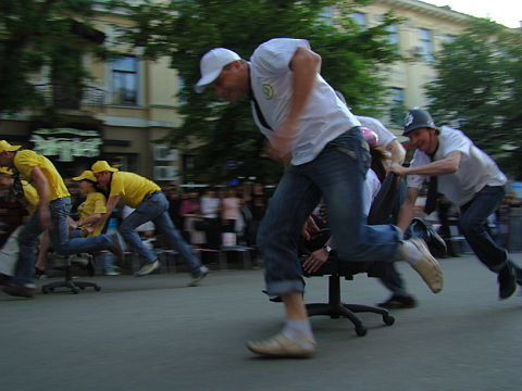 Первый этап – гонка на офисных стульях — начался с представления каждого из 4 смельчаков — 1 девушка и 3 парня — участников команды и знакомства с их транспортными средствами. На выдумку ребята оказались богаты: на суд изумленных зрителей выкатили гоночные модели… офисных стульев. Расположившиеся на них милые участницы успевали заигрывать с публикой, а трое молодых ребят, толкавших стул, выкрикивать речевки. Зрелище само по себе было более чем увлекательным. Ведь кто же из нас не любит быстрой езды??? Но езду на офисных, да и любых других стульях родной город видел впервые. Команды приложили максимум усилий и показали настоящий rasing, не хуже, чем Шумахер на «Формуле-1».