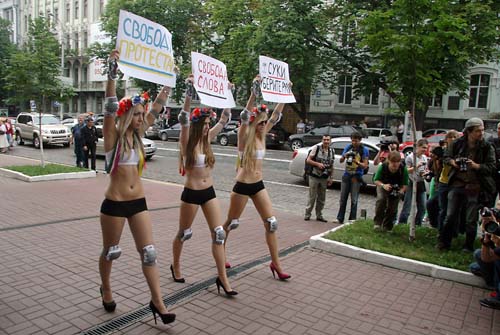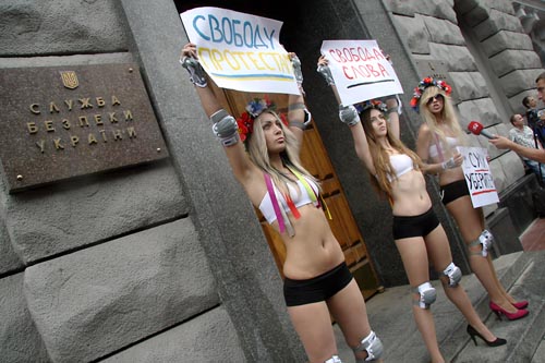 Вместо ранее анонсированной акции против давления СБУ на общественные организации, цензуры и монополизации СМИ, в ходе которой девушки планировали в образе “сучек” высмеять мелко-интриганскую политику нынешнего главы СБУ Валерия Хорошковского, направленную на запугивание и шантаж, представительницы женского движения FEMEN вышли к центральному входу в здание СБУ с плакатами “Свободу протестам”, “Стоп цензуре”, “Суки, уберите руки”.