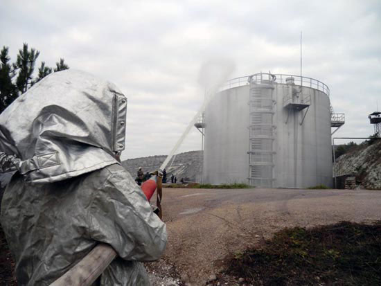 На помощь пожарной команде нефтебазы, которые приступили к тушению пожара приехали спасатели МЧС. Пожарные начали эвакуировать рабочих из опасной зоны. На втором этапе учений прибыли дополнительные силы. Чтобы подойти ближе к очагу пожара спасатели работали в специальных теплоотражательных костюмах, которые защищают от высокой температуры.