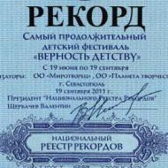 Интересно то, что фестиваль «Верность детству 2011» был проведен с 19 июня по 19 сентября и был занесен в Книгу рекордов Украины, получив сертификат национального реестра рекордов как самый продолжительный. В 2012 году крымский фестиваль длился 6 месяцев и снова попал в Книгу рекордов Украины.