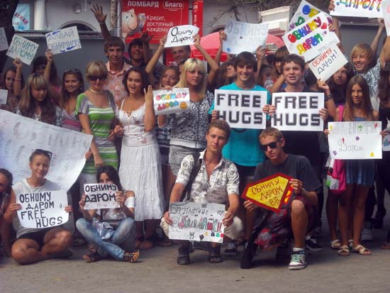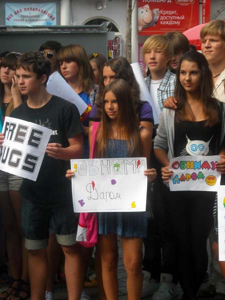 Седьмого августа в центре Севастополя состоялась уже традиционная акция «Обниму даром». Суть заключается в том, чтобы обнимать незнакомых людей и дарить прохожим хорошее настроение. Поучаствовать в флэш-мобе собрались около ста пятидесяти молодых ребят. Возрастная категория участников – от 10 до 18 лет.
